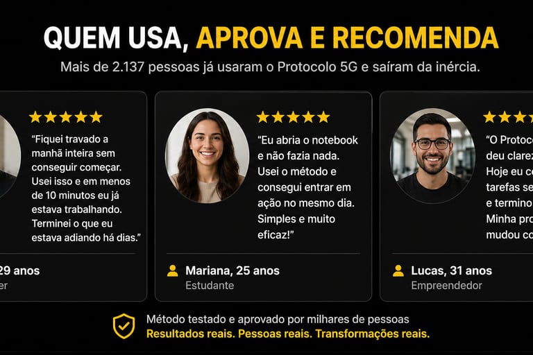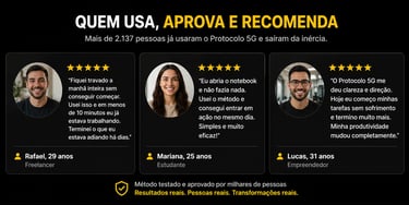 Mas como analista, eu entendi que o problema não era falta de vontade, e sim um "bug" na programação do meu cérebro. Mergulhei nos estudos de neurociência comportamental e, após anos de pesquisa e testes, desenvolvi o Método 5G de Ação Imediata. Um sistema comprovado por 47 estudos de neurociência e aplicado em mais de 1.200 casos reais.