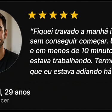 "Como freelancer, eu vivia uma batalha diária contra a procrastinação, perdendo prazos e sentindo meu potencial travado. Tantas ideias, mas pouca execução.